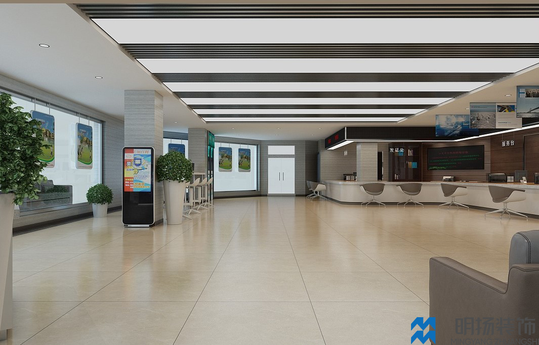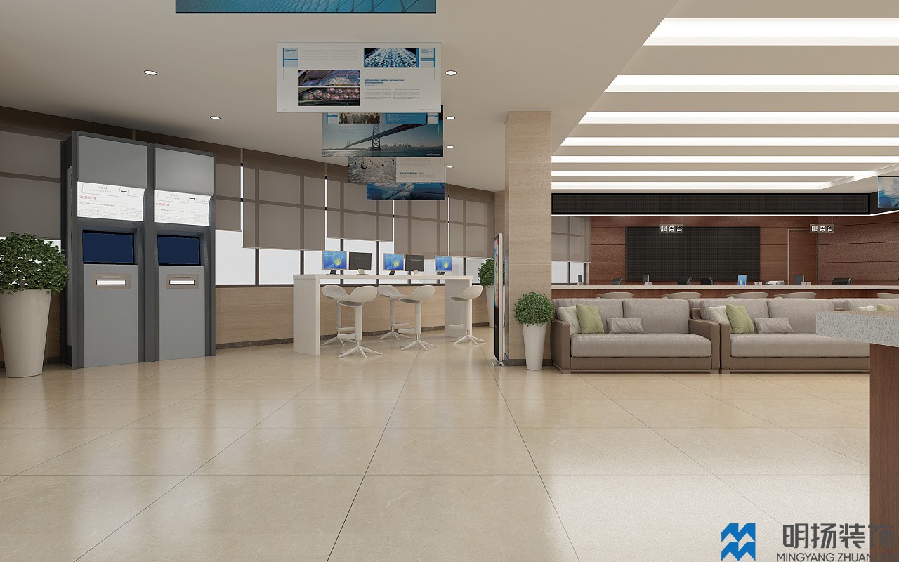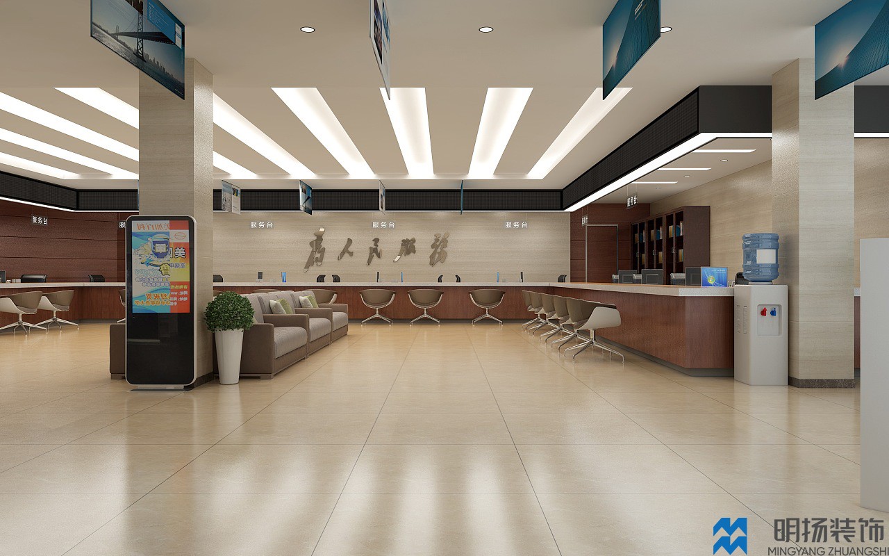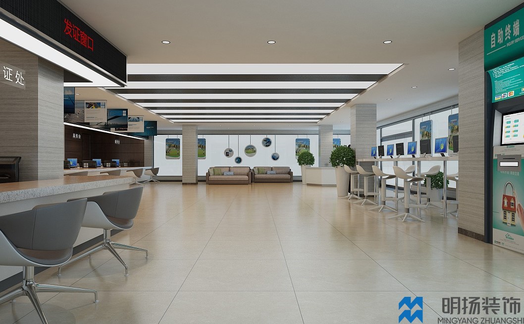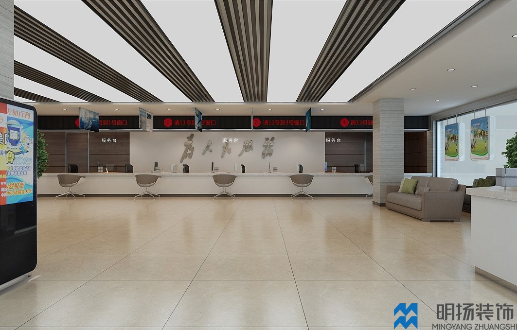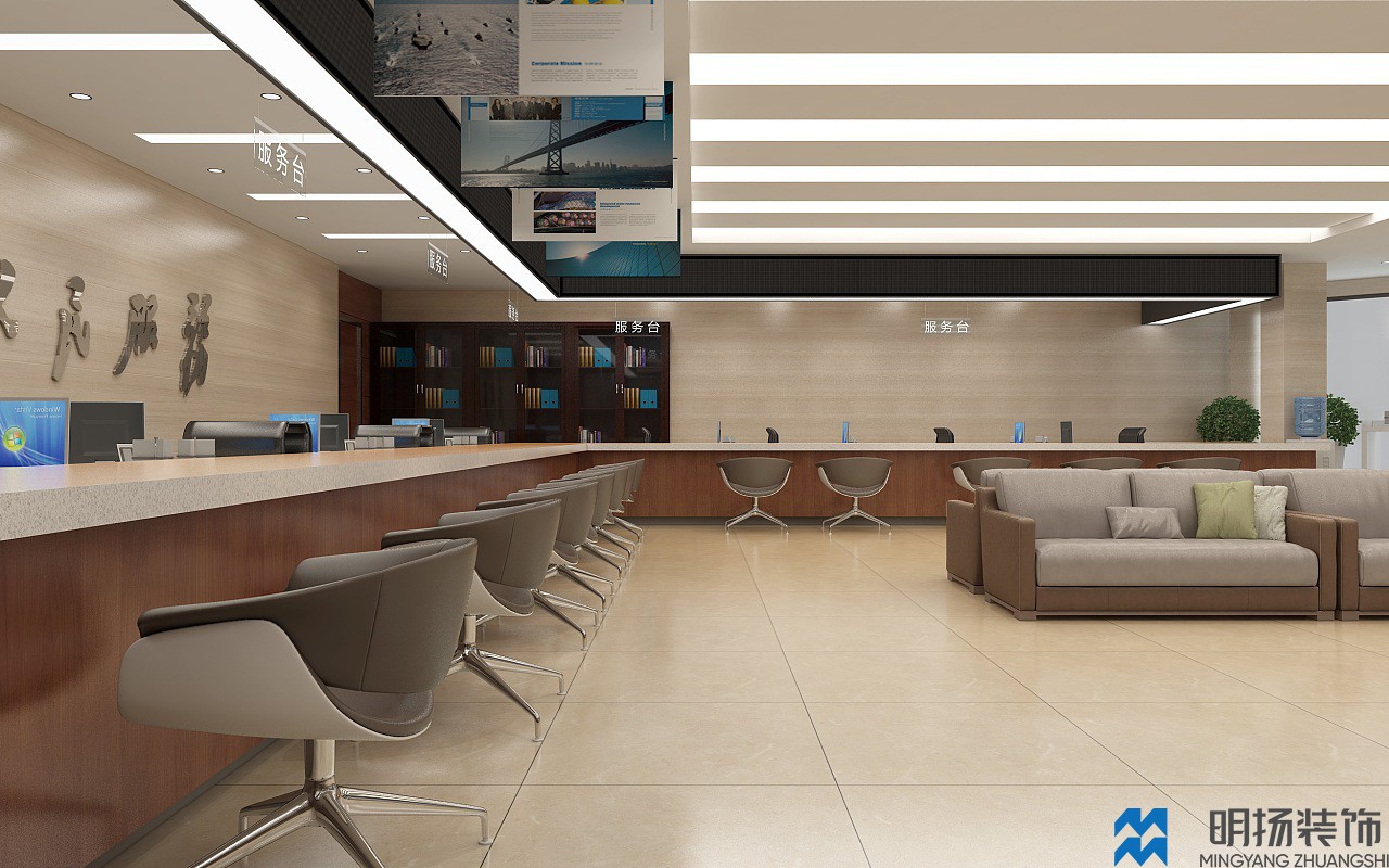 成都某政務大廳裝修效果圖,采用米色,白色,褐色等帶溫馨色調的顏色風格,充分體現(xiàn)辦事處盡職盡責,體恤民眾的氛圍。